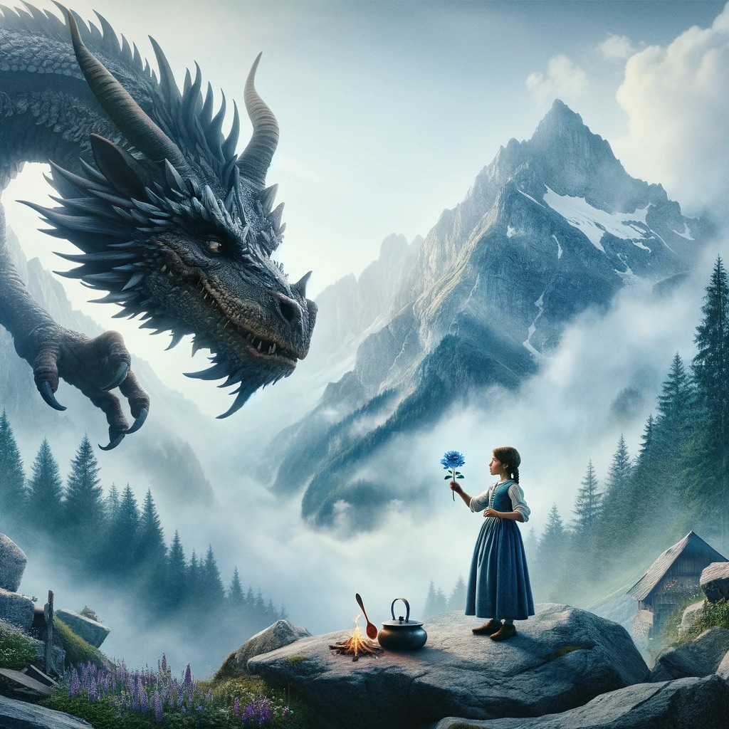 Als Ida den Gipfel des Nebelberges erreichte, fand sie den Blauen Enzian, bewacht von einem mächtigen Drachen.